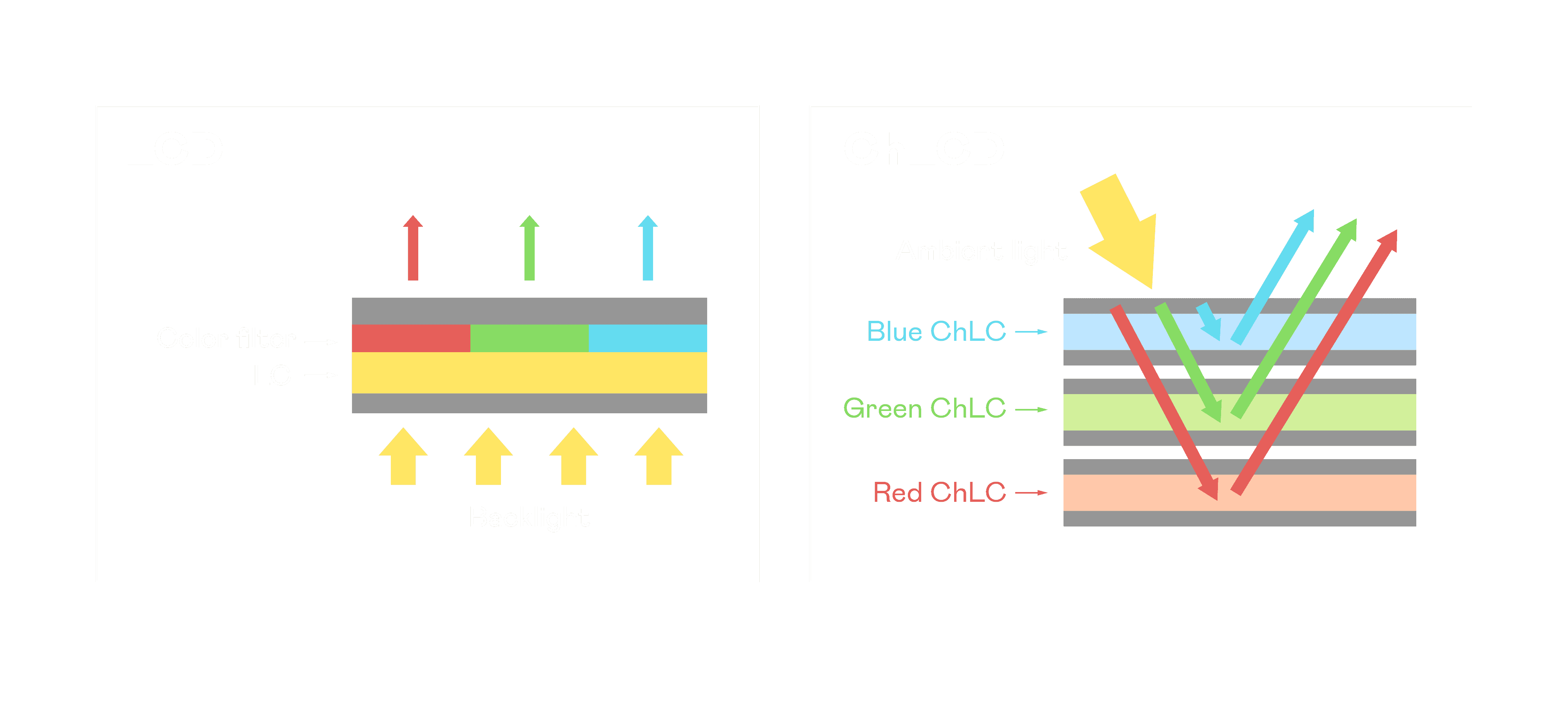 ChLCD 胆固醇液晶就如同纸张一样,,,透过反射环境光来显示影像,,因此长时间观看不易造成人眼视觉疲劳,,,,可达到护眼效果。。。当处于户外阳光下使用,,,LCD 影像容易失真而不易观看,,,,但胆固醇液晶仍可维持较佳的影像品质。。